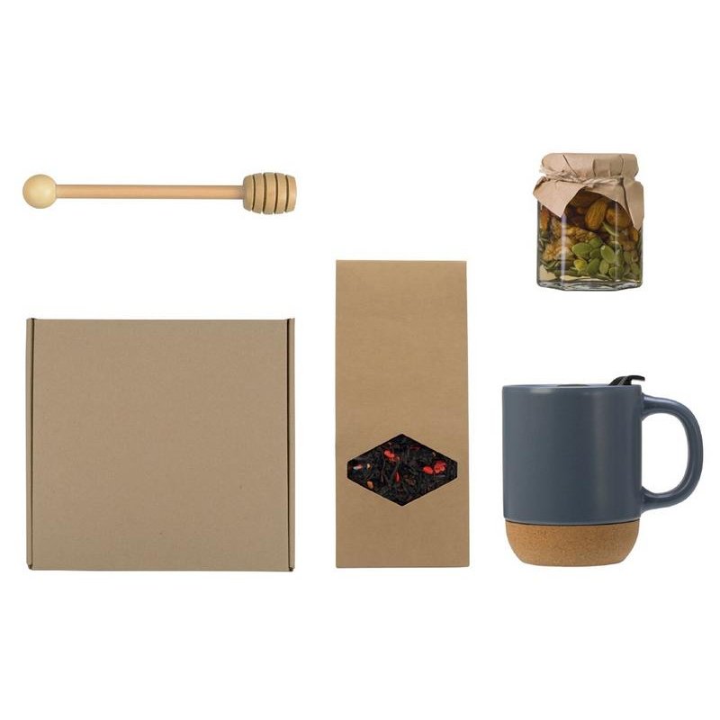 - Материал товара:кружка - керамика, пробка, мед в банке - стекло, ложка - бамбук, чай - крафт-коробка, коробка - картон