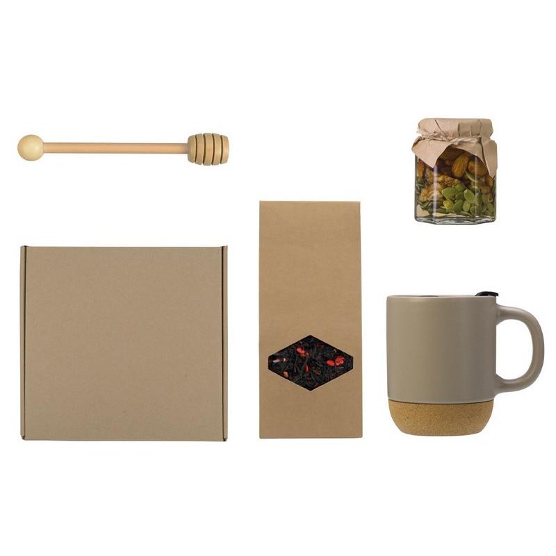 - Материал товара:кружка - керамика, пробка, мед в банке - стекло, ложка - бамбук, чай - крафт-коробка, коробка - картон