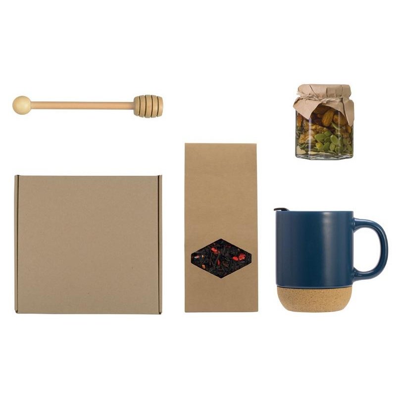 - Материал товара:кружка - керамика, пробка, мед в банке - стекло, ложка - бамбук, чай - крафт-коробка, коробка - картон