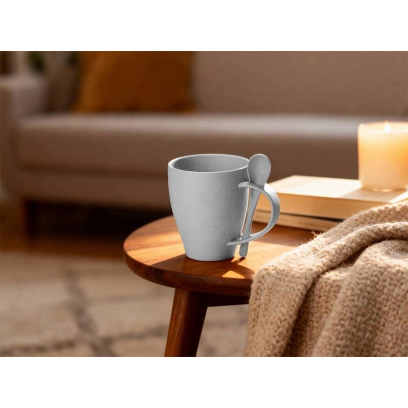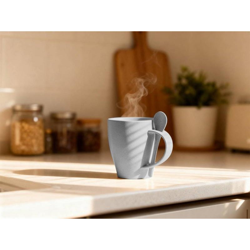 Кружка Nina состоит из смеси ПП-пластика (50%) и переработанной пшеницы (50%), что делает ее настоящим экомерчем. Поверхность кружки имеет приятный бежевый оттенок с небольшими вкраплениями-точками темно-серого цвета, которые только подчеркивают природное происхождение Nina.