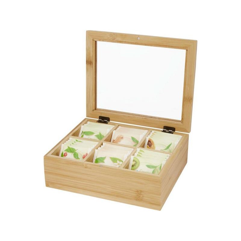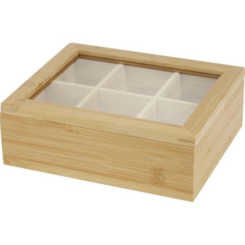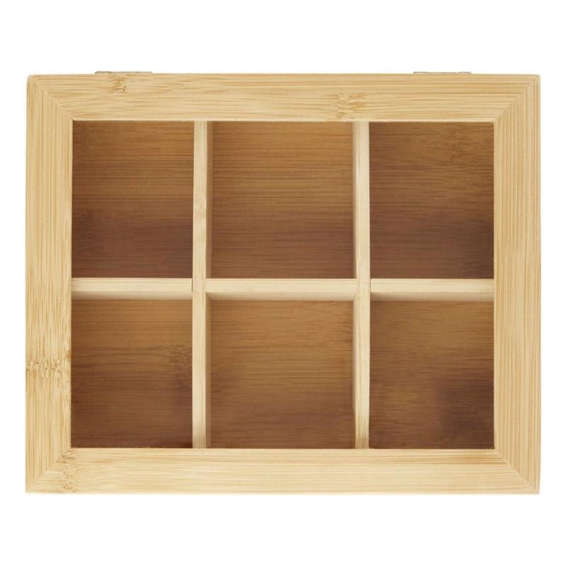 Бамбуковая коробка для чая с прозрачной стеклянной крышкой. Имеет 6 одинаковых по размеру отделений для хранения до 36 чайных пакетиков. Стекло поставляется с защитной пленкой с обеих сторон для предотвращения царапин, которую можно легко снять перед использованием. Бамбуковое дерево, Стекло.