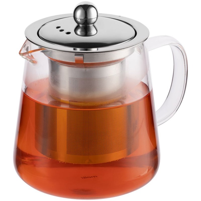 Стеклянный чайник с ситечком и крышкой из металла.
