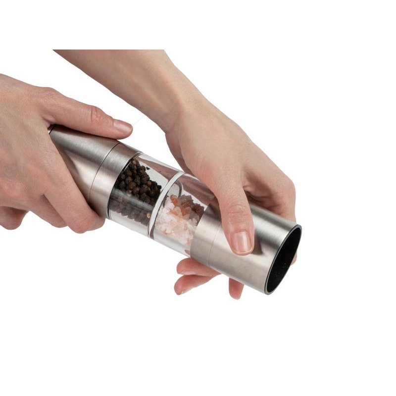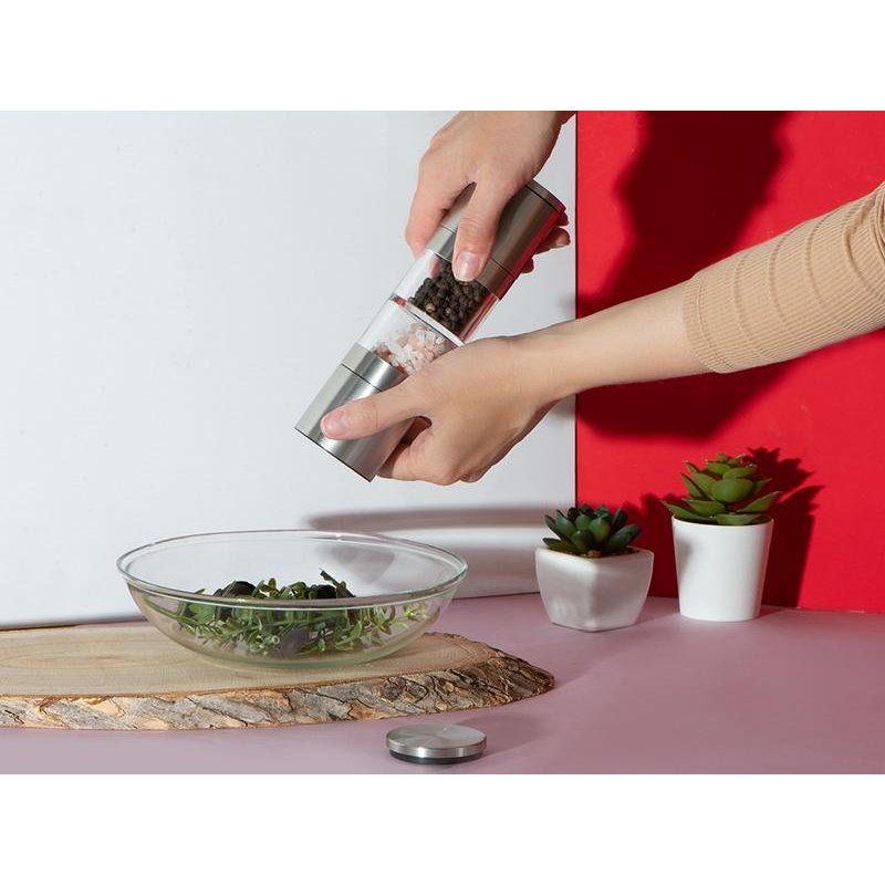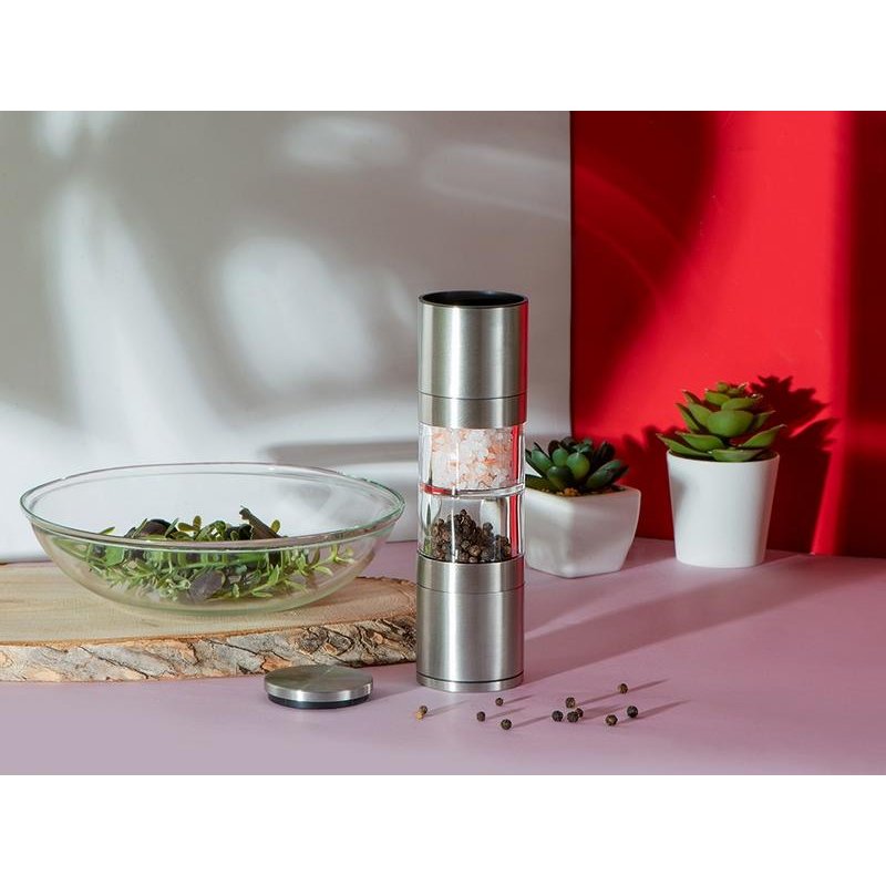 Главный плюс мельницы Twin — сразу два отсека для специй, благодаря чему вы сможете сэкономить место на кухне, объединив в одном устройстве сразу два вида приправ. Керамические жернова не боятся коррозии, а высококачественная нержавеющая сталь обеспечивает изделию длительный срок жизни. Кроме того, есть и возможность управления степенью помола при помощи тумблера.