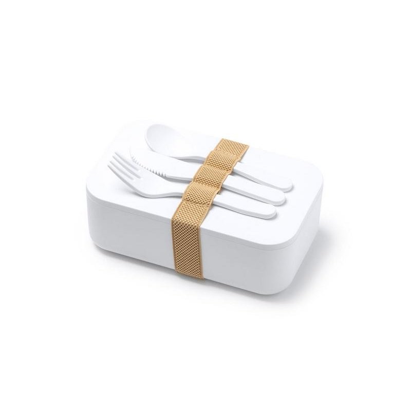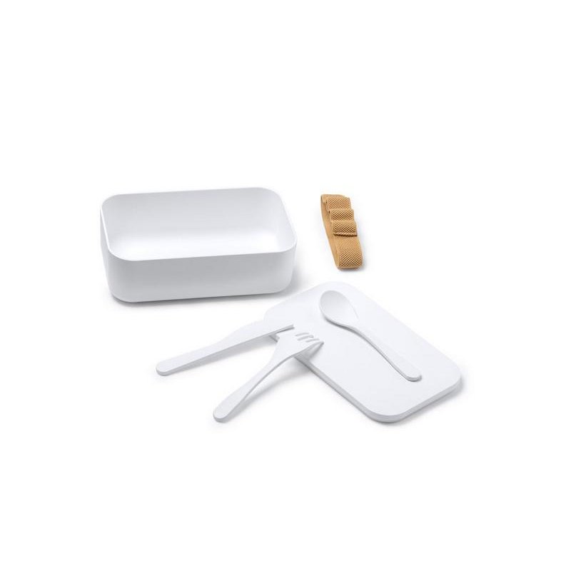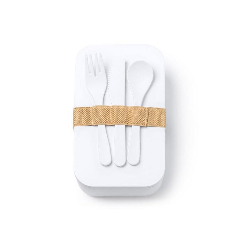 Ланч-бокс из PLA с силиконовым ремешком для регулировки. В комплекте вилка, ложка и нож. Емкость 1 л Наслаждайтесь едой в любом месте.