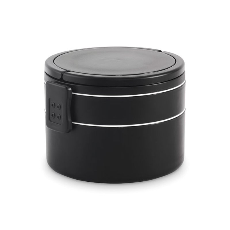 Двухъярусный круглый ланчбокс из полипропилена с боковой застежкой-клипсой и ручками. Есть внутренние крышки белого цвета. Объем: верхняя часть 250 мл, нижняя часть 700 мл.