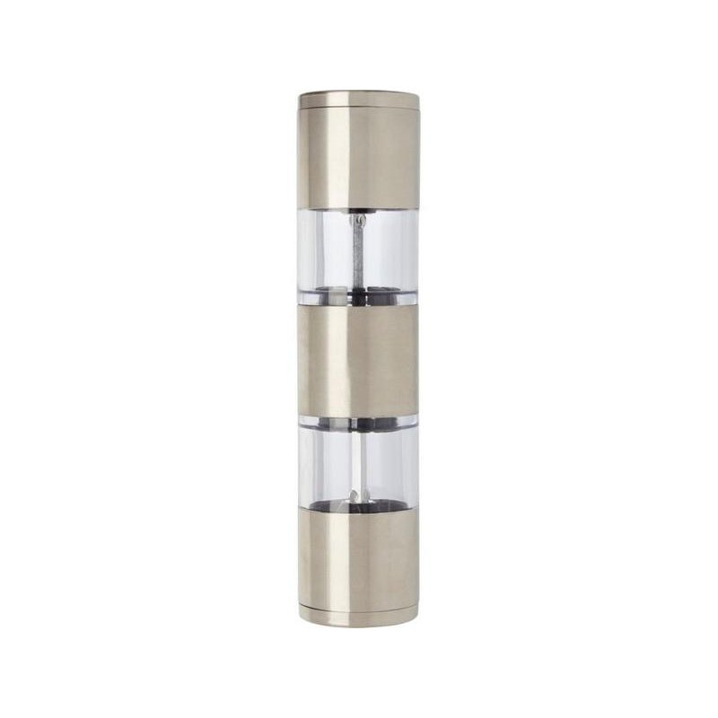 Двусторонняя мельница с одной стороной для соли, а второй для перца. Перец и соль в комплект не входят. Нержавеющая сталь, пластик PS.