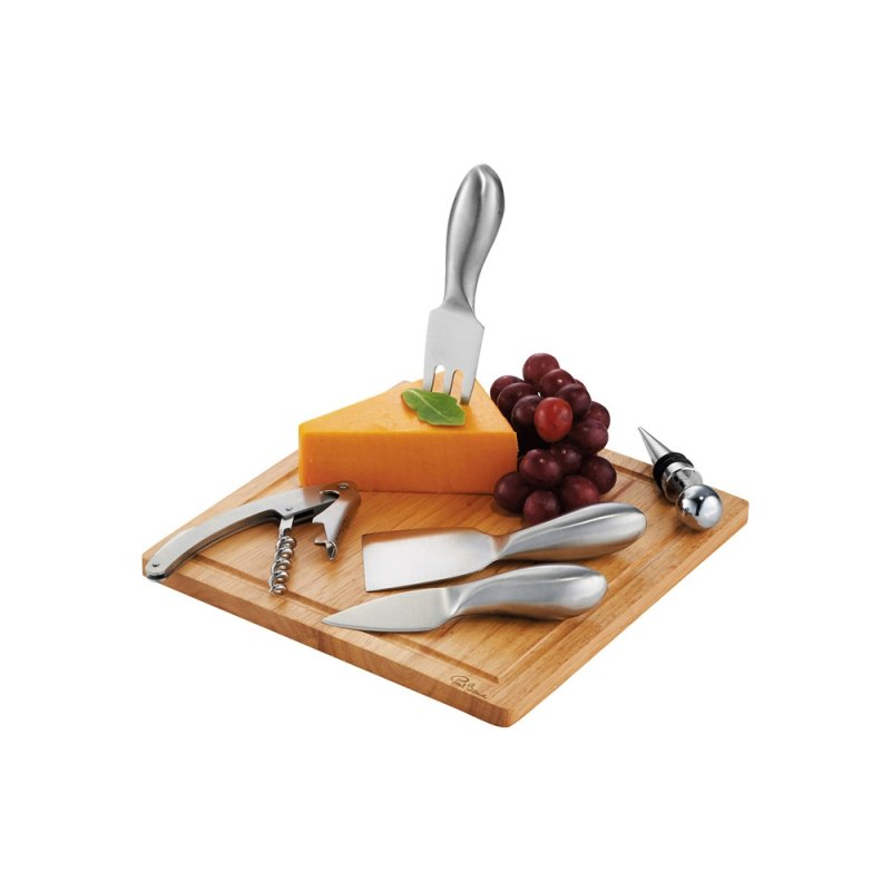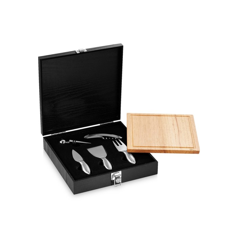 Набор для сыра и вина Mino. В этот набор из 6-ти предметов входит деревянная разделочная доска, три ножа для мягкого сыра, твердого и зрелого сыра, стоппер для вина и штопор. Набор предлагается в деревянной подарочной коробке с шильдом 40 х 25 мм для лого.