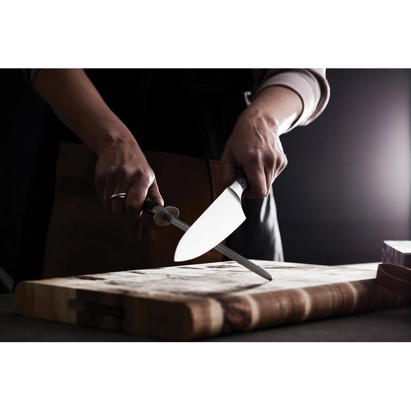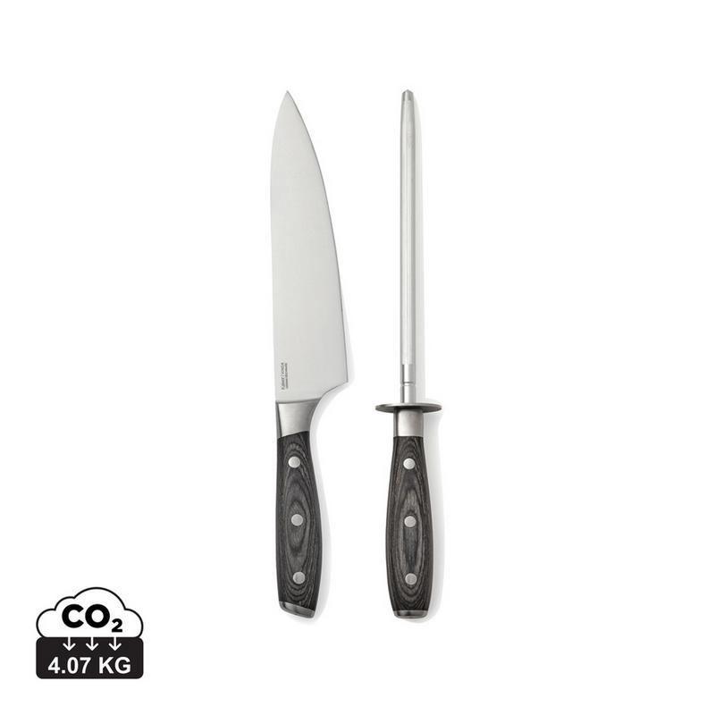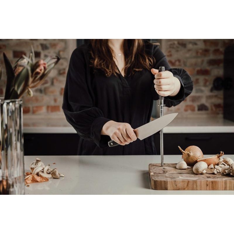 Почувствуйте себя настоящим шеф-поваром с набором из серии Kaiser! Он состоит из точилки и кухонного ножа, изготовленных из немецкой нержавеющей стали. Их ручки сделаны из паккавуда — это материал, состоящий из древесины ценных пород и смолы. Так называемая ламинированная древесина получается очень прочной и долговечной, не скользит в руке, не впитывает запахи и не поддается влаге. Сталь устойчива к повреждениям и неприхотлива в уходе: достаточно лишь периодически затачивать нож, и он прослужит вам долгие годы.