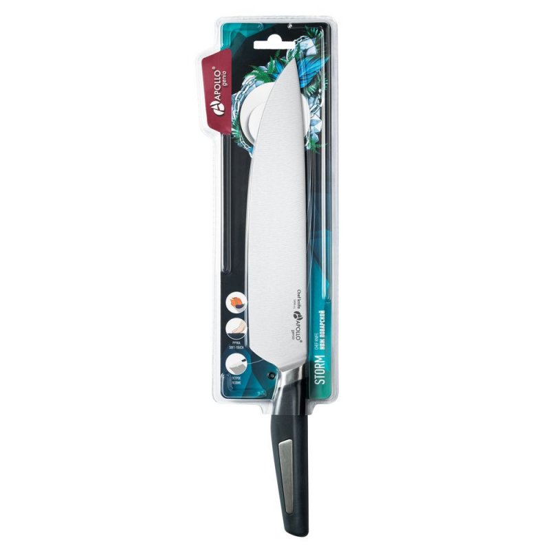 Серия ножей Storm имеет кованую гарду, которая делает нож прочным и сбалансированным, а работу с ним легкой и удобной. Лезвие ножа Storm выполнено из нержавеющей стали и долго держит заточку. Специальная форма рукоятки и ее приятное на ощупь прорезиненное покрытие не позволяют ножу выскальзывать из руки во время использования.