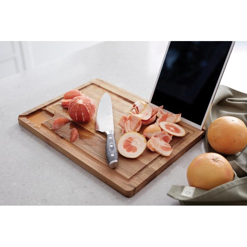 Стильная разделочная доска украсит любую кухню. Изготовлена из натурального тика, сертифицированного FSC, древесина которого со временем темнеет и становится еще красивее. Высокое содержание масла защищает доску от влаги. Специальная канавка позволяет аккуратно нарезать даже самые сочные фрукты и овощи, не запачкав стол. Есть специальная подставка для телефона или планшета, чтобы готовить по любимым рецептам стало еще проще.