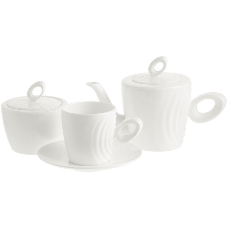 Крышка сахарницы создана в скульптурной технике: фарфор запечатлел словно сам момент движения. Необычная ручка предметов символизирует камень, от которого появляются завораживающие круги на воде.