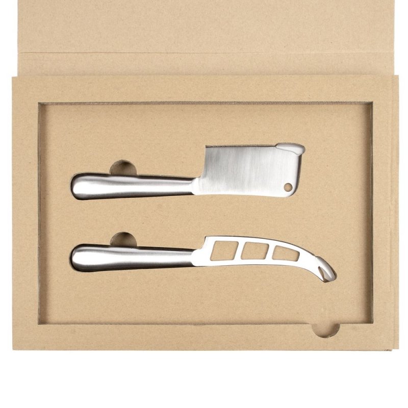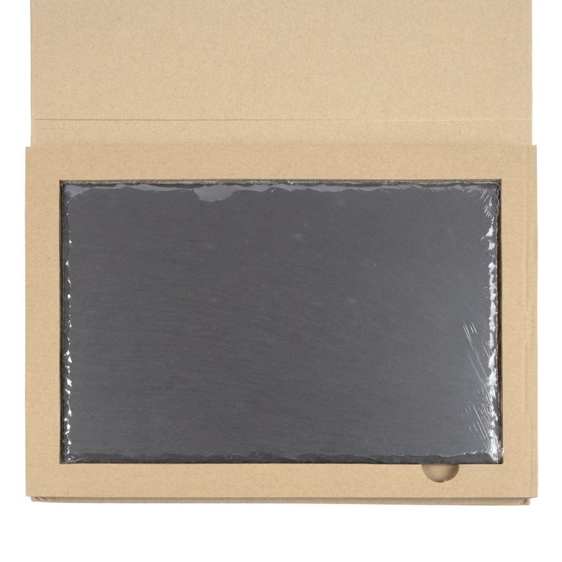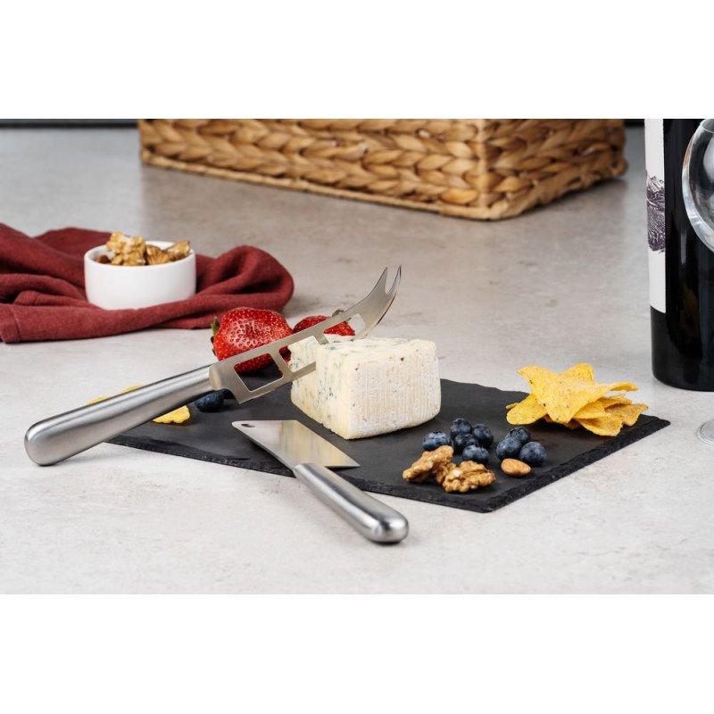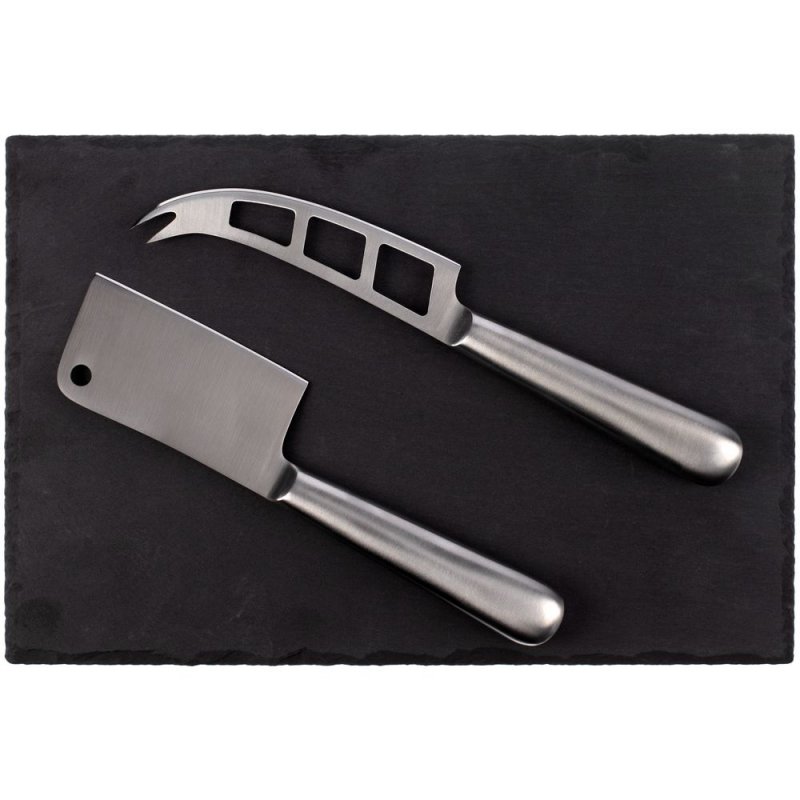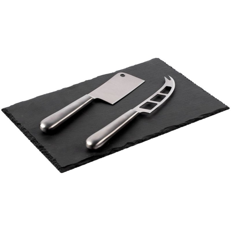 В комплекте сланцевая доска, нож-топорик для твердых сортов сыра, нож для сыров средней мягкости.