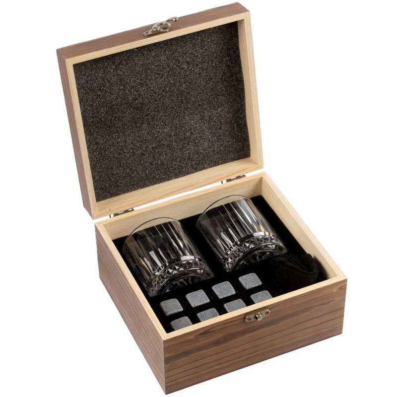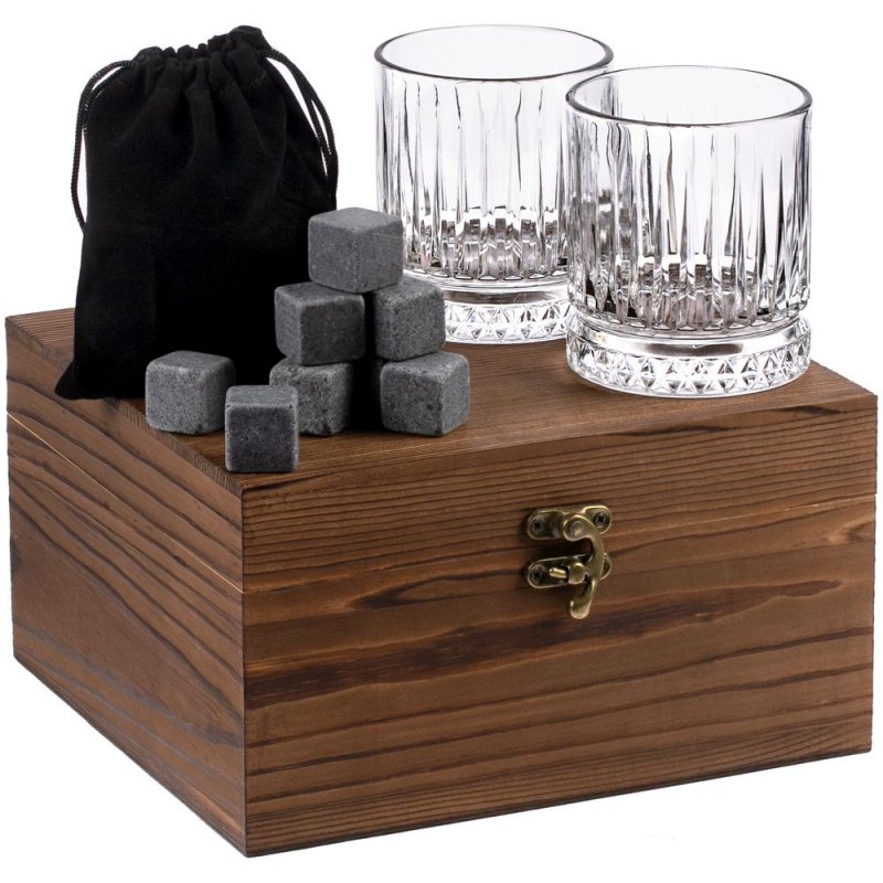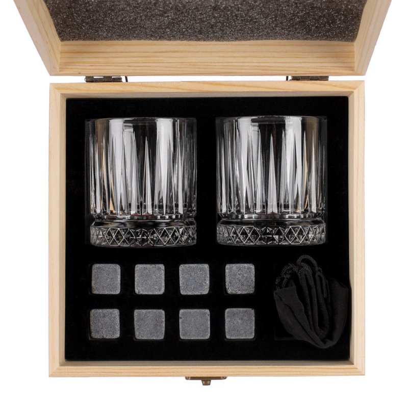 В наборе: 2 стакана (210 мл), 8 камней для виски, мешочек для камней.