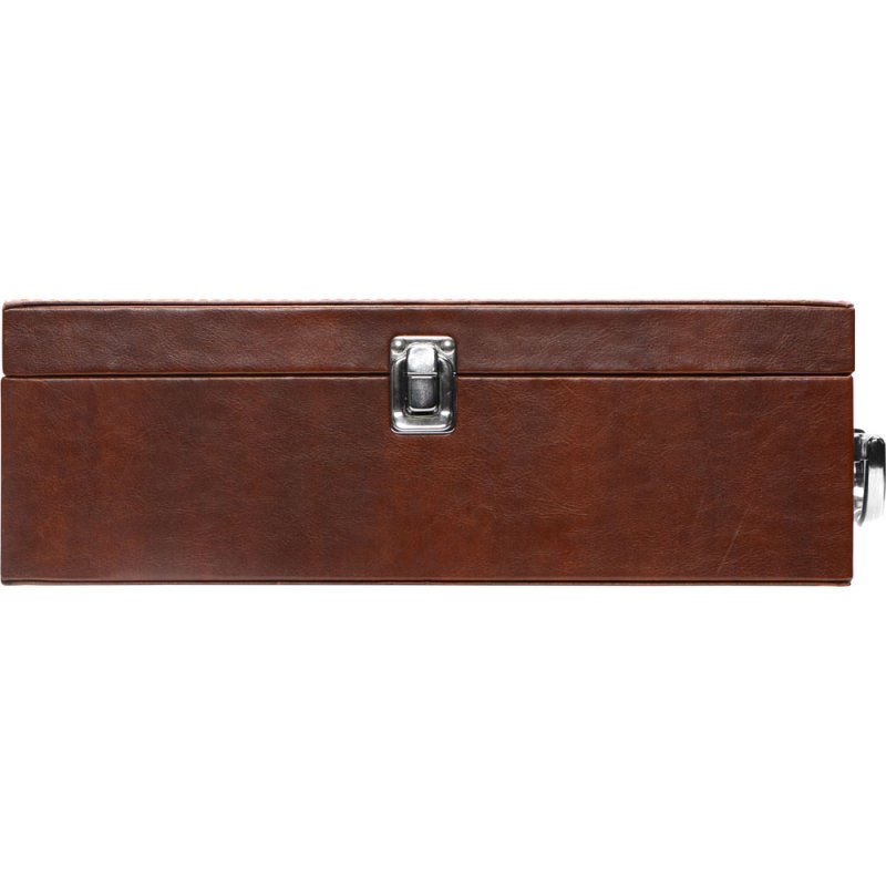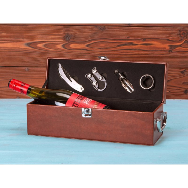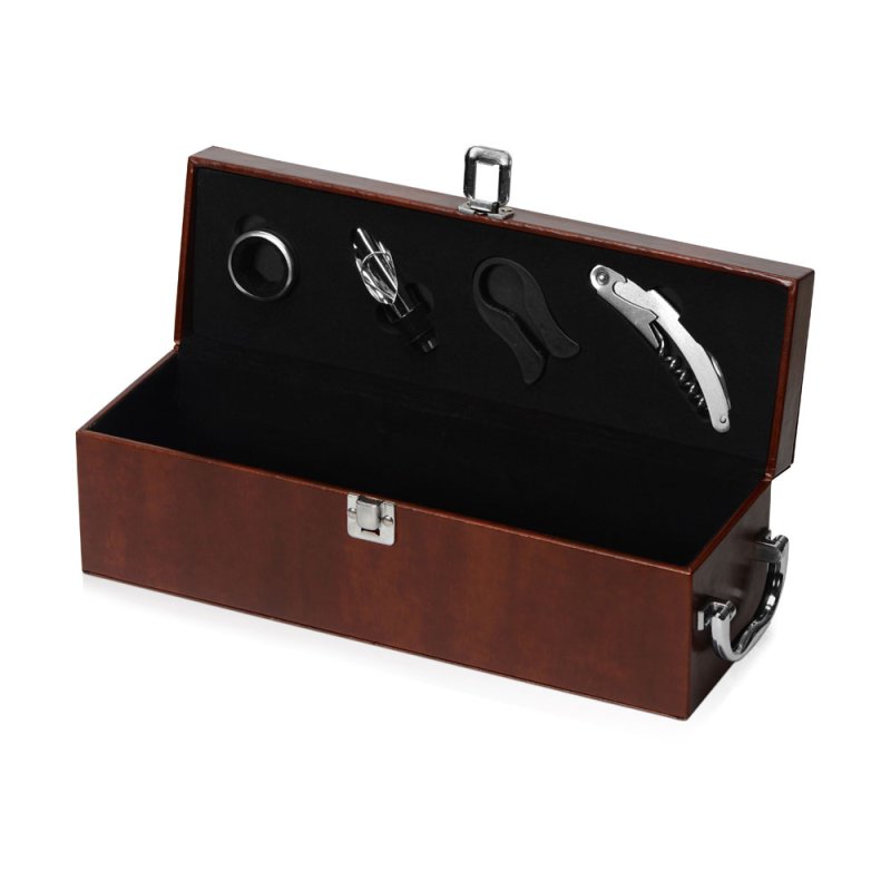 Самое главное — это футляр, в котором находится набор: принадлежности расположились в вырубленных нишах на крышке, а большое основное отделение предназначено для бутылки вина.
