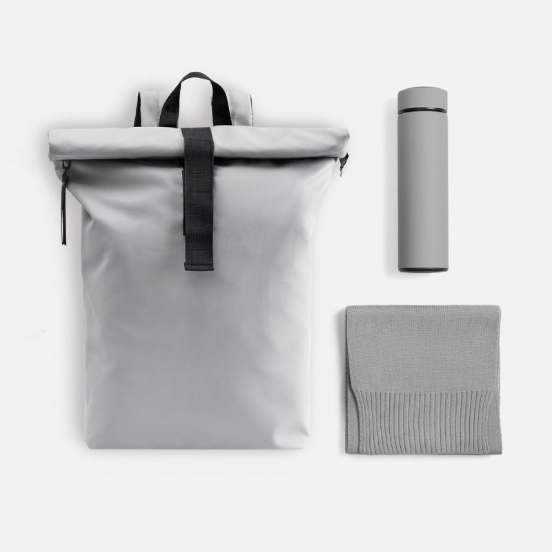 Составляющие набора — шарф и термос — помогут оставаться стильным и, что немаловажно, довольным даже в холодное время года. Модный и практичный рюкзак с удобной регулировкой объема роллтоп всегда подстроится под ситуацию, а потому станет просто незаменим как ежедневно в городе, так и в путешествии.