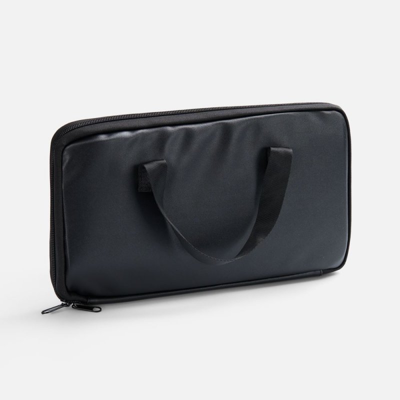 - Размеры:сумка: 33,5х3х19 см; точилка: 7,8х1х5 см; нож для овощей: 19,5х1,6 см; универсальный нож: 23,5х1,6 см; нож сантоку: 29,5х1,9 см; разделочная доска: 28х15,5х1,2 см