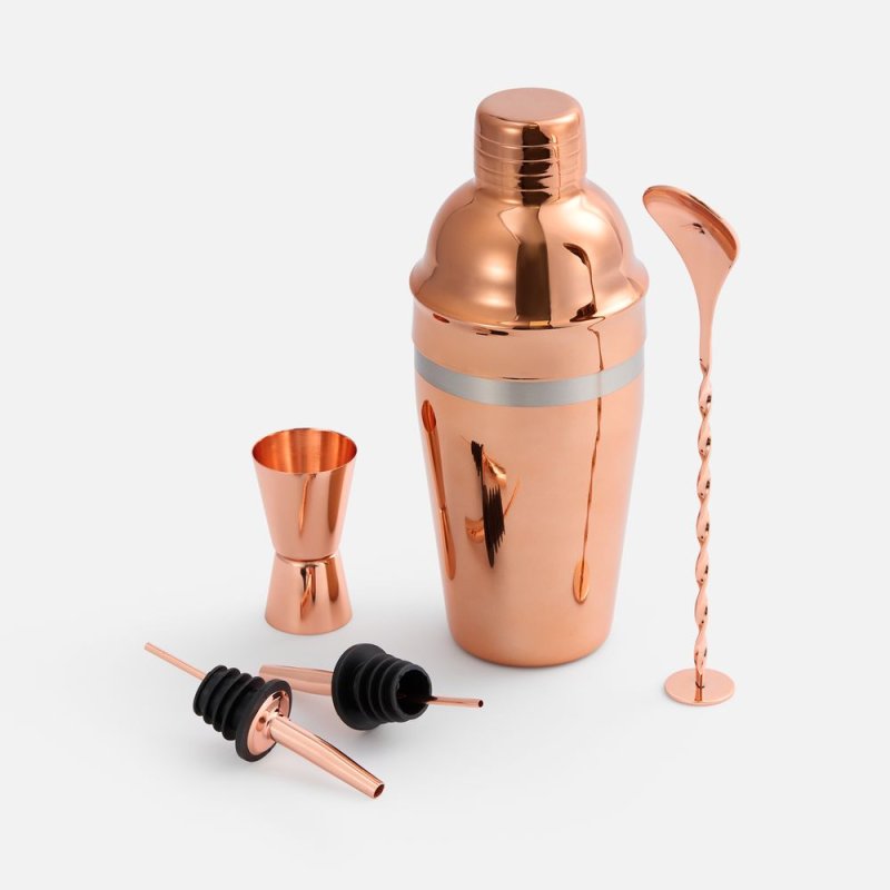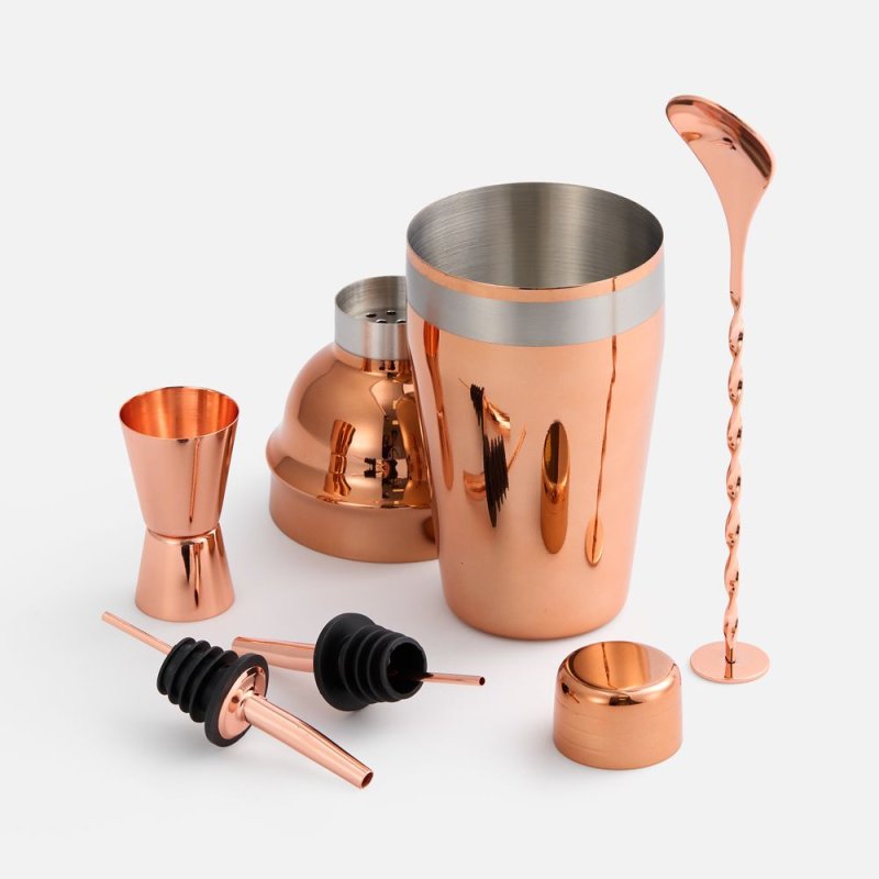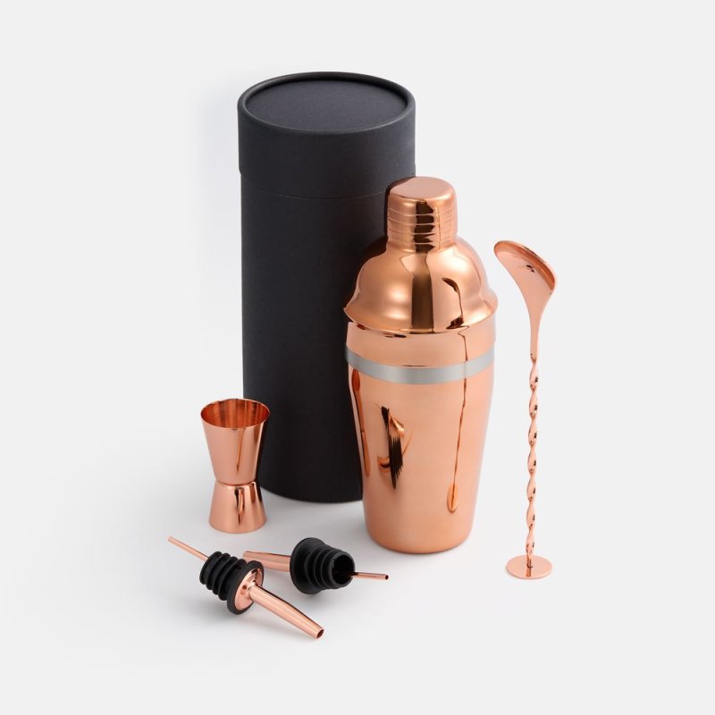 - Размеры:шейкер: диаметр 8,1 см, высота 21 см; джиггер 3,8х3,8х6,8 см; барная ложка 20,5 см; гейзер 10,3х2,9х2,9 см; упаковка 23х10х10 см