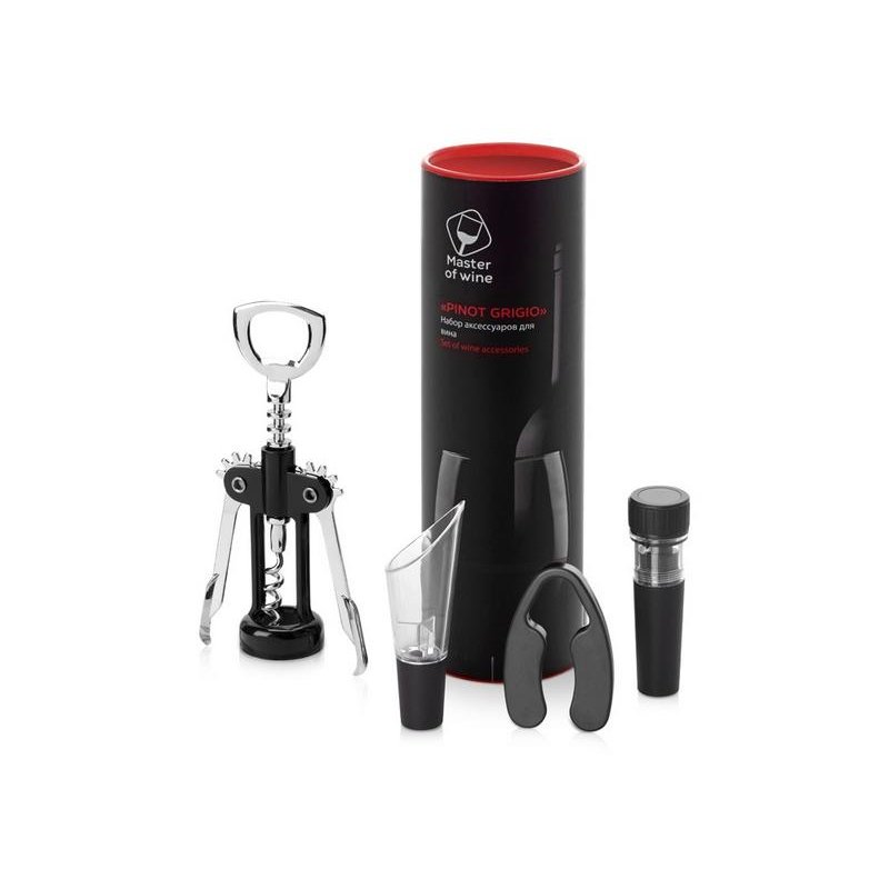В винном наборе Pinot Grigio собрано все, что необходимо для откупоривания, подачи и длительного хранения вина. Аксессуары поставляются в эффектном красном тубусе и брендированном шубере.