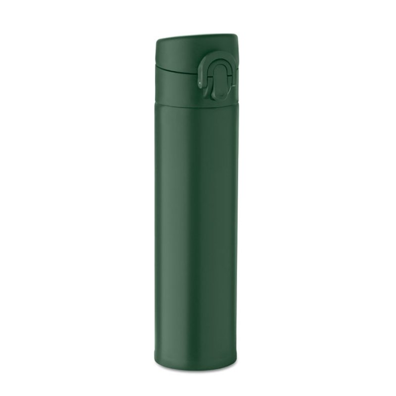 Double wall drinking bottle in recycled stainless steel (90% recycled stainless steel and 10% stainless steel) with security lock on the lid and press-to-open option. Leak free. Capacity: 300ml.