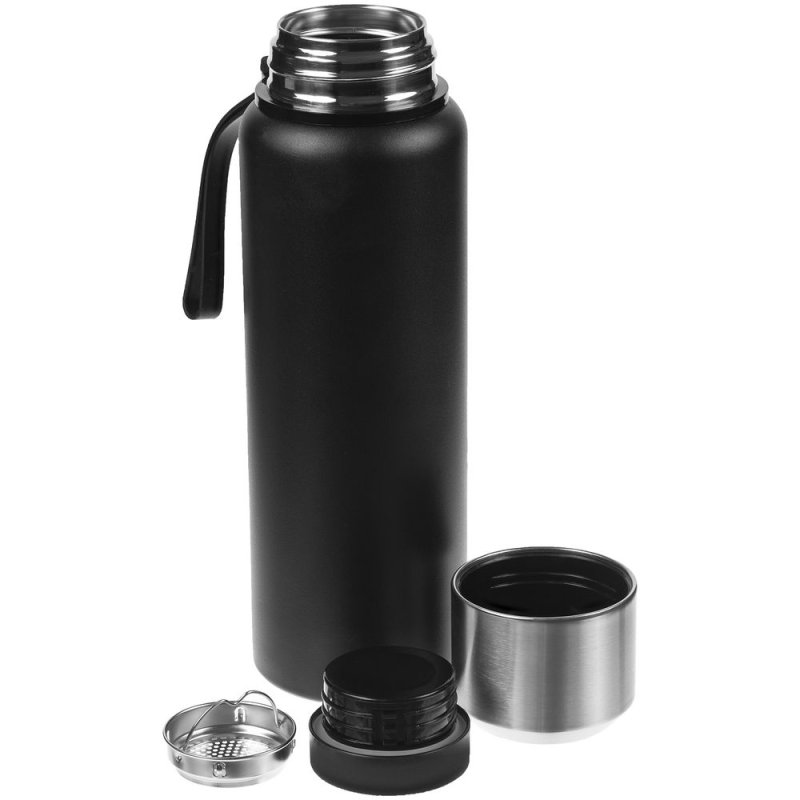 Термос в строгом металлическом корпусе с вакуумной изоляцией. Завинчивающаяся пробка, крышка-чашка и ситечко для фильтрации — в таком термосе удобно заварить чай или кофе. Напиток останется горячим, а чаинки не попадут в чашку.