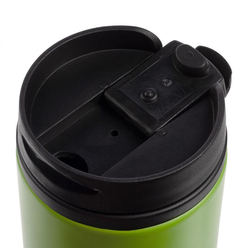 Двухслойная конструкция из пищевого пластика внутри и нержавеющей стали снаружи. Герметичная завинчивающаяся крышка с откидным клапаном для питья.