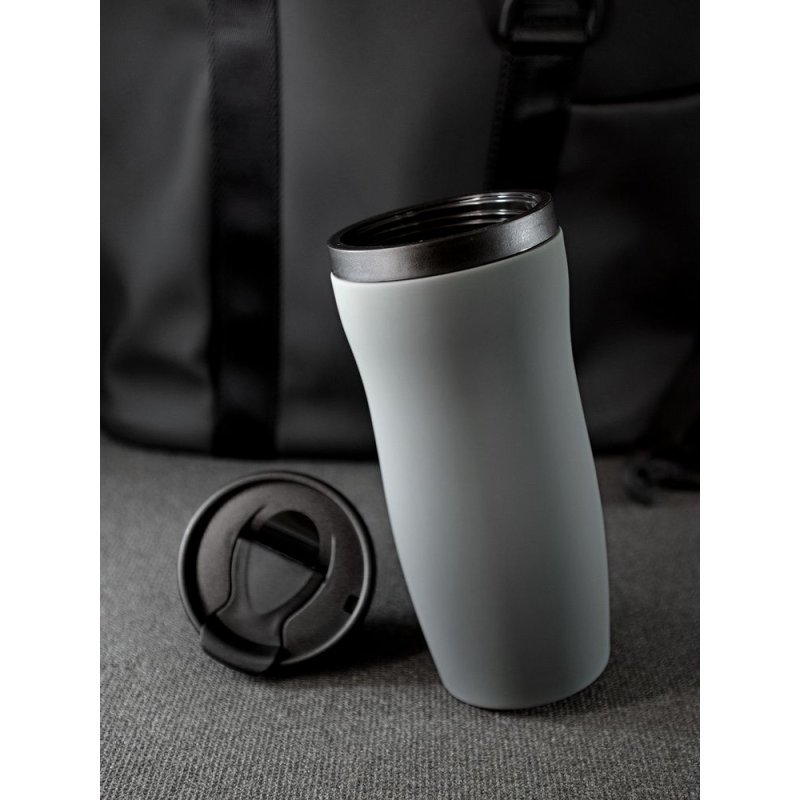 Двухслойная конструкция из нержавеющей стали снаружи и пищевого пластика внутри. Герметичная завинчивающаяся крышка с откидным клапаном для питья. Покрытие софт-тач. В отверстие в крышке можно вставить шнурок для удобного ношения стакана на руке. Шнурок в комплект не входит.