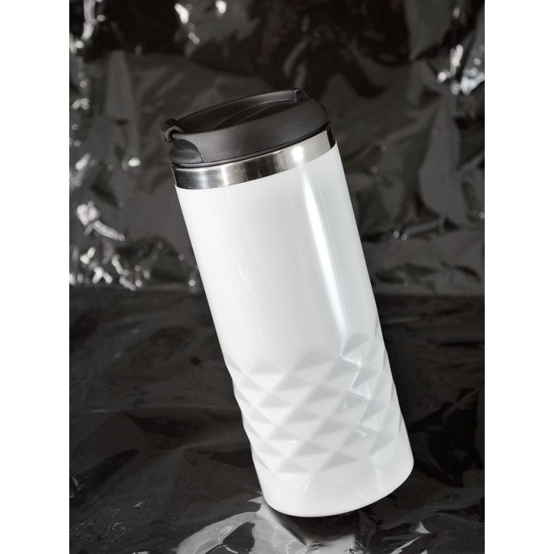 Покрытие кружки напоминает глянцевую эмаль — и рельеф на поверхности корпуса дополнительно подчеркивается яркими бликами.