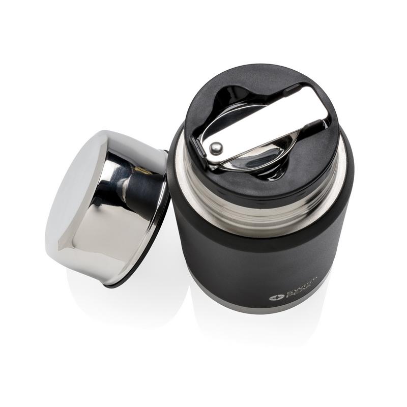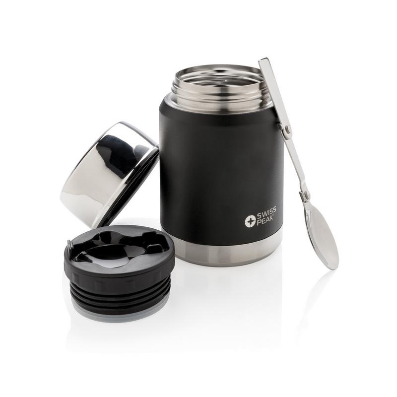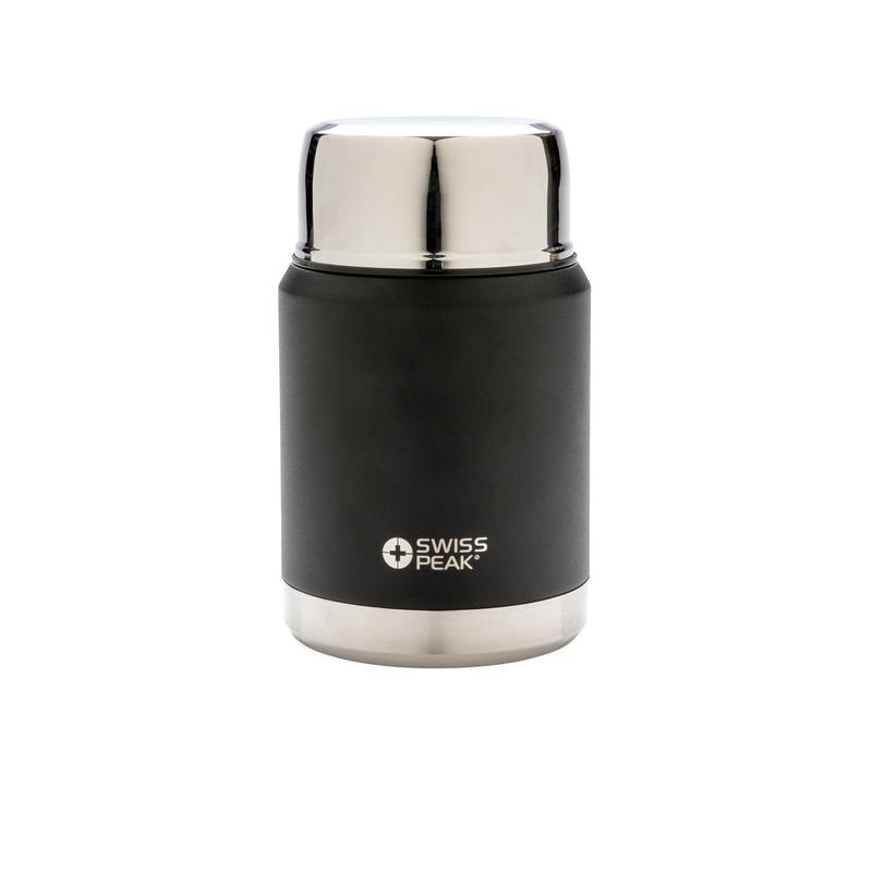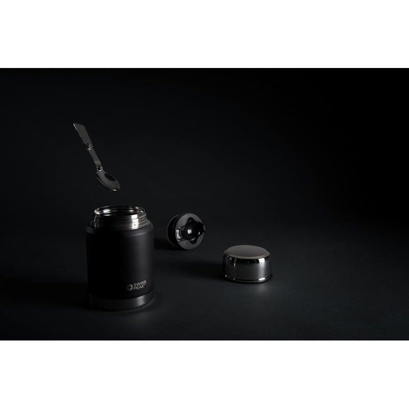 Коллекция Swiss Peak Elite с вакуумной изоляцией и двойными стенками из нержавеющей стали 18/8. Долговечное внешнее покрытие черного цвета, которое не облезет и не потрескается. Внутренние стенки покрыты медью, что обеспечивает максимальную проводимость для того, чтобы напитки сохраняли тепло до 8 часов или оставались холодными до 24 часов. Этот контейнер для еды сохранит вашу еду горячей или холодной в течение целого дня! В комплекте ложка из нержавеющей стали 18/8. Только ручная мойка. С защитой от протекания. Объем 500мл.