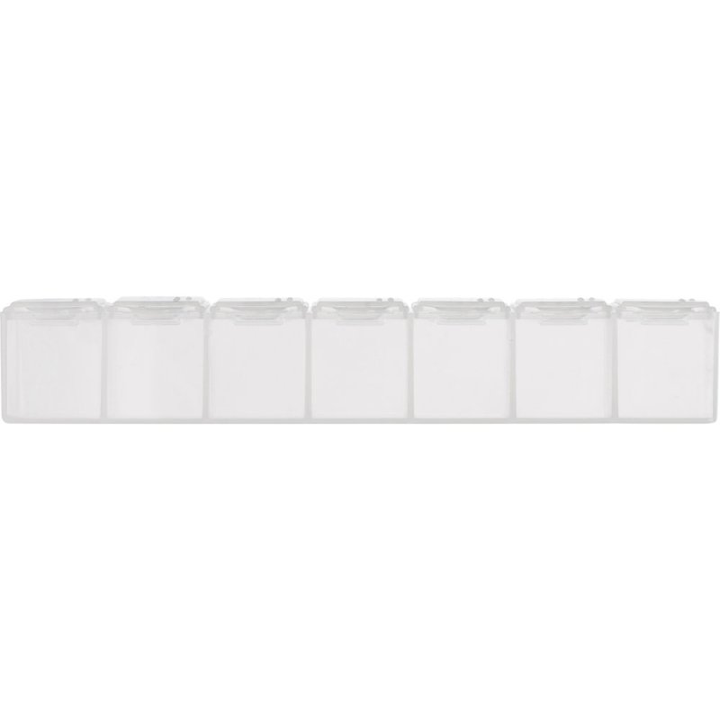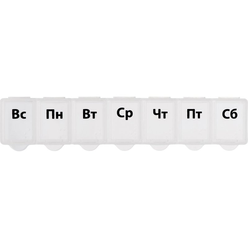 Таблетница с днями недели. Надписи продублированы шрифтом Брайля на английском языке.