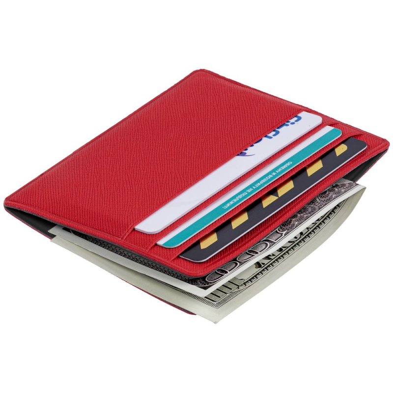 Чехол для карточек из искусственного материала, имитирующего сафьяновую кожу, с шестью отделениями для кредитных карт и одним — для сложенных купюр.