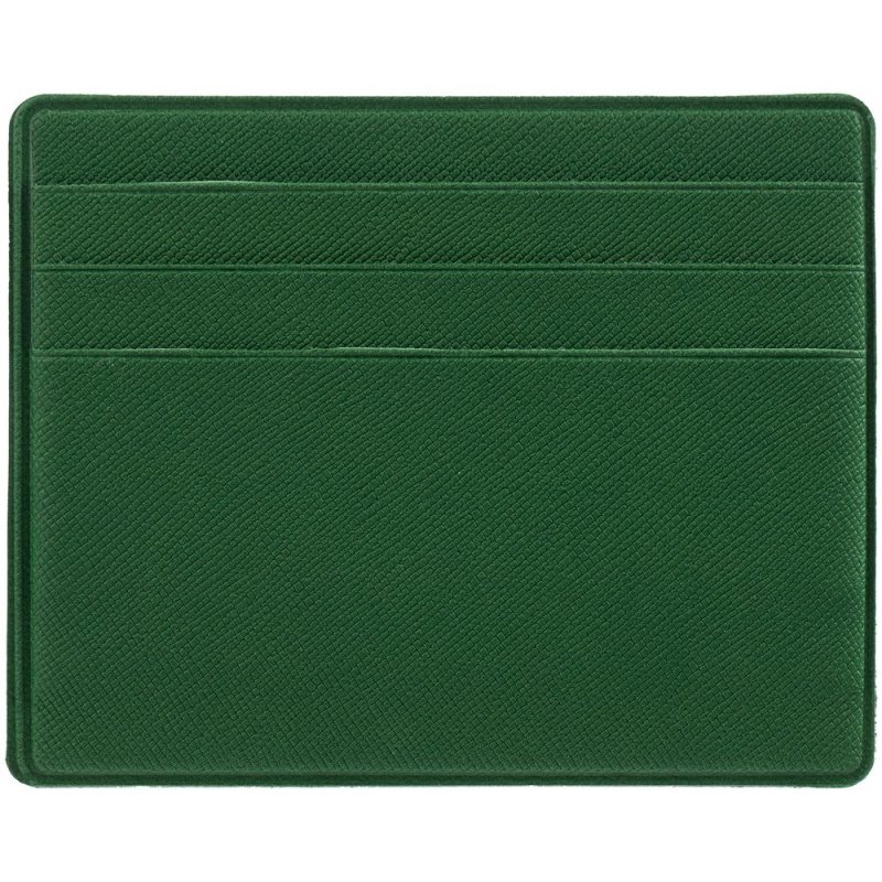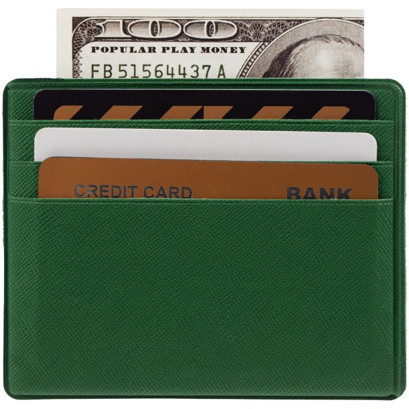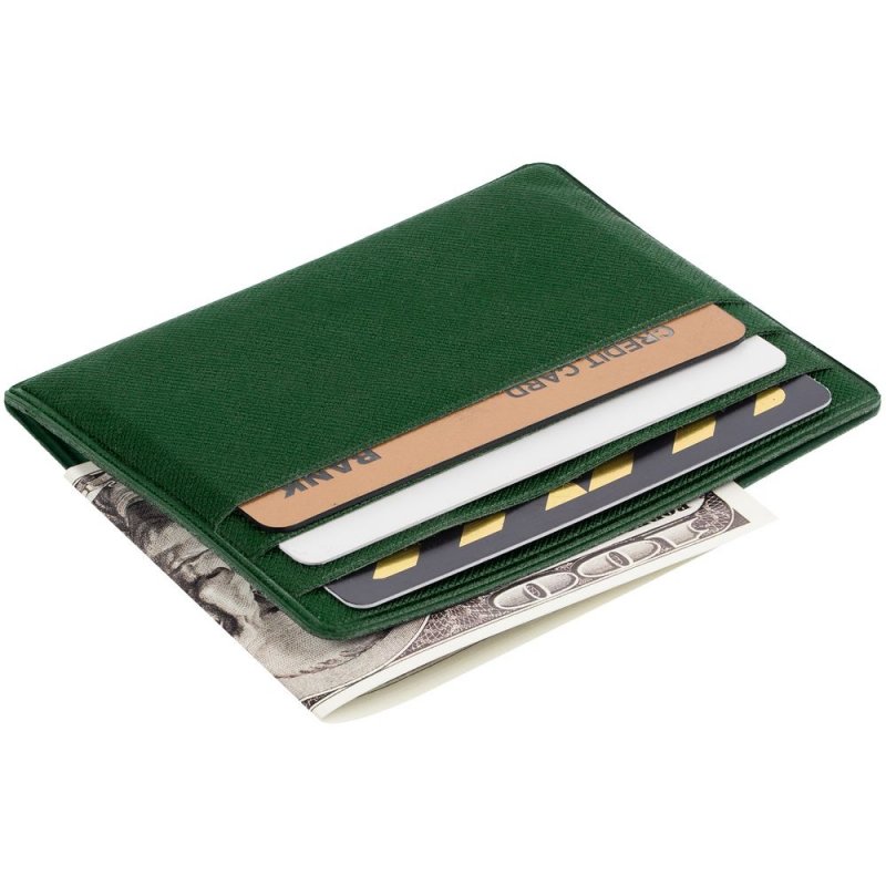 Чехол для карточек из искусственного материала, имитирующего сафьяновую кожу, с шестью отделениями для кредитных карт и одним — для сложенных купюр.