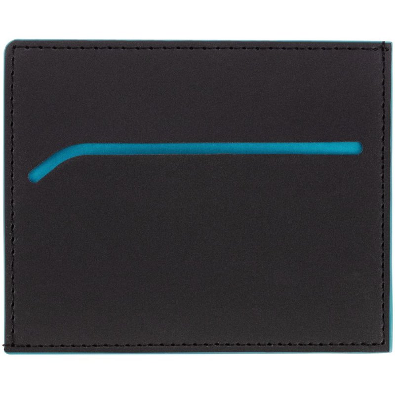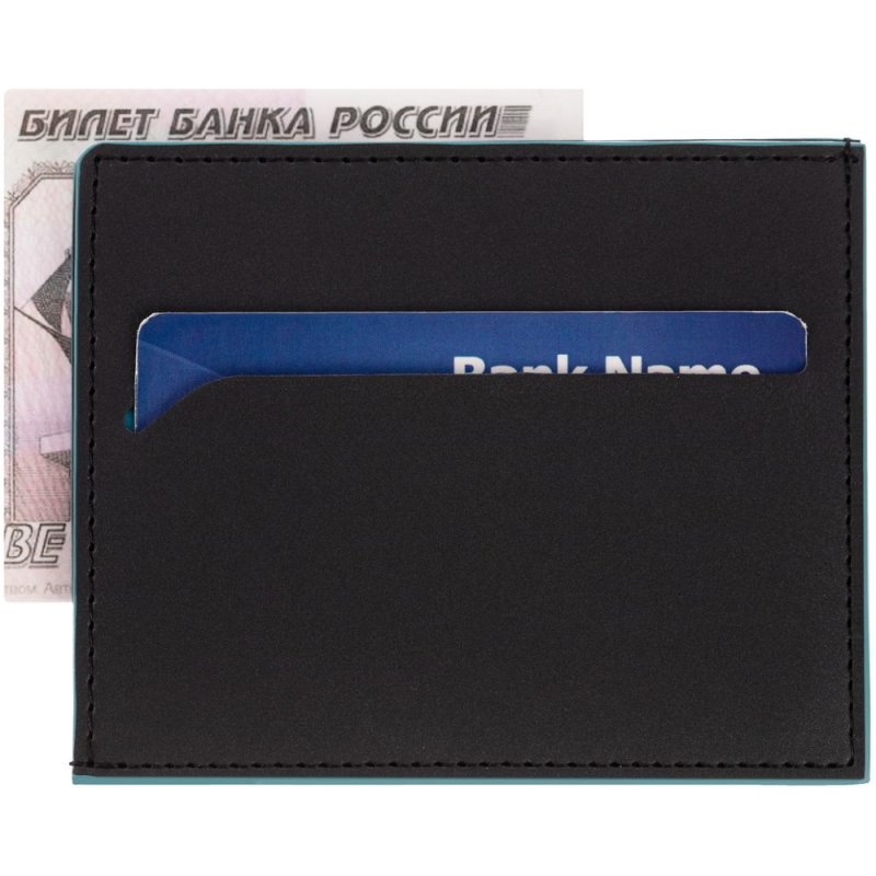 Чехол выполнен из материала Soft Touch Pearl, черный АА, дополнен окрашенным срезом края и внутренним карманом из цветного картона. Имеет 4 отделения для кредитных карт и 1 отделение для купюр.