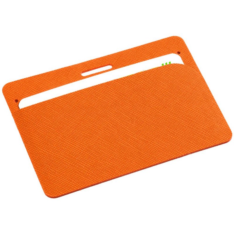 Чехол для карточки с пластиковым окошком из искусственного материала, имитирующего сафьяновую кожу.