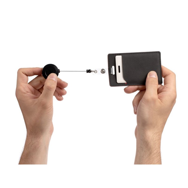 Ретрактор крепится к одежде, а с другой стороны можно поместить бейдж, визитку или магнитную карту. В корпусе спрятан сворачивающийся шнур, который позволяет при необходимости демонстрировать содержимое держателя, не снимая его.