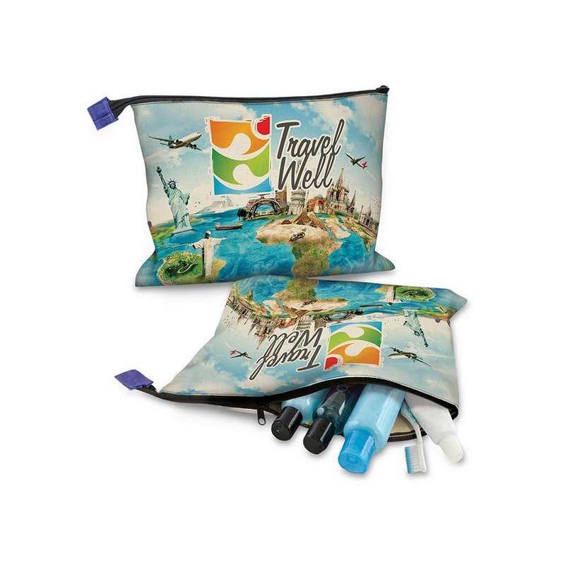 Дорожная косметичка из натурального хлопка - незаменимый спутник в поездках. Классическая форма и мягкий материал позволяет компактно хранить косметику и гигиенические принадлежности, необходимые в дороге. Яркий элемент - цветная вставка на хлястике молнии, доступна в 16 цветах. Полноцветная печать доступна на обеих сторонах.