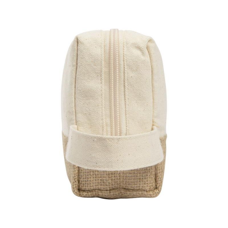Вместительная косметичка классической формы, визуально разделенная на две части в оттенках небеленой ткани. Нижняя часть косметички выполнена из джута, верхняя – из хлопка. Материал подкладки – полиэстер. Минимальное использование синтетических тканей, экологичный продукт. За счет эргономичной формы, вместительности и ручки идеальна для путешествий.