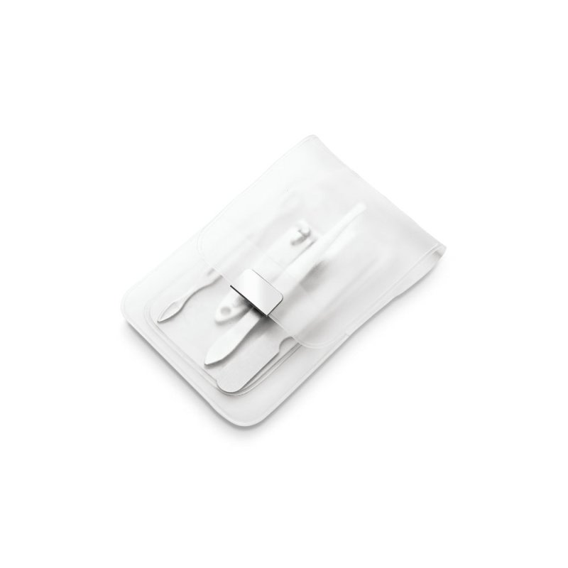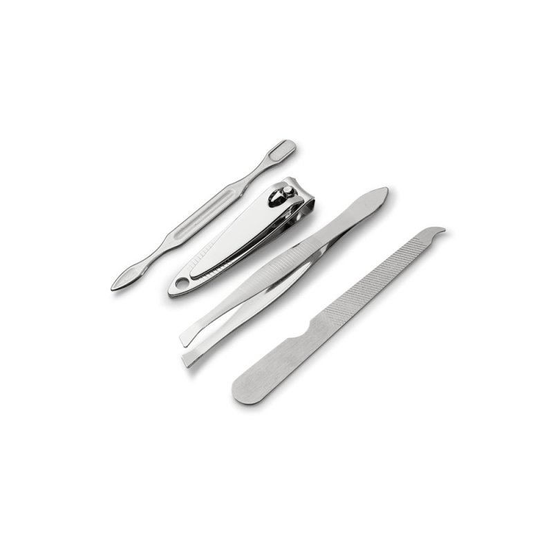 Набор из 4 предметов для маникюра в пакете из ПВХ, состоящий из пилочки, пинцета, щипчиков для ногтей и лопатки для кутикулы. 66 x 105 мм. Вид нанесения, рекомендуемый поставщиком: трафаретная печать, гравировка.