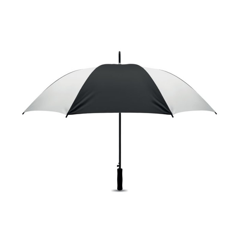 27 inch auto open umbrella in 190T pongee with black plated metal shaft and ribs. Black plastic tips. Straight black EVA handle. Manual closure.