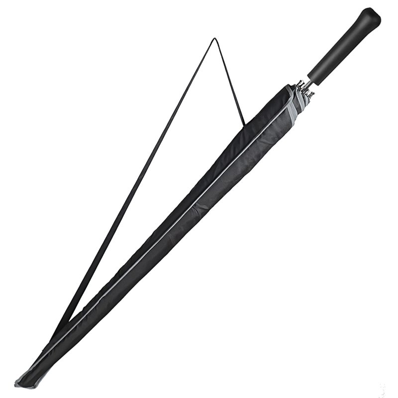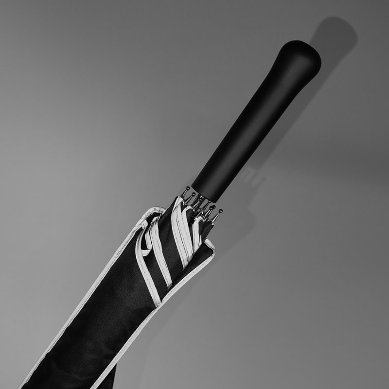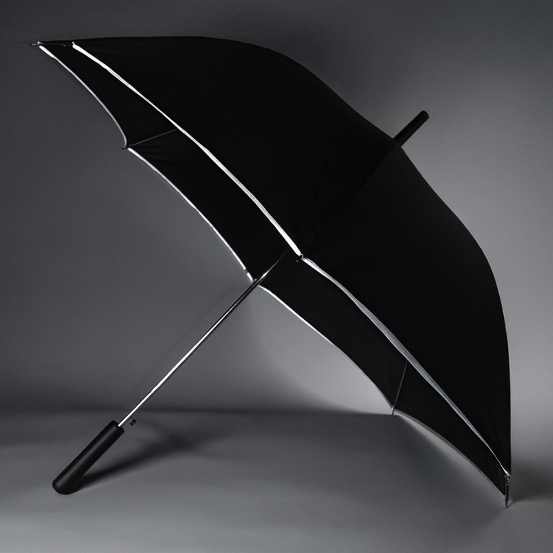 Зонт-трость, механический.Диаметр купола: 102 см., длина стержня 80 см.Состав купола: 100% полиэстер 190T, эпонж.Цвет купола: чёрный + светоотражающий кант.Состав стержня: металл.Состав спиц: металл..Ручка: пластик.Зонт упакован в чехол из основного материала с ручкой.Чехол окантован светоотражающим кантом.