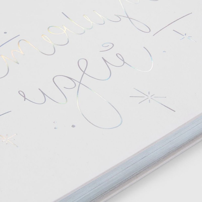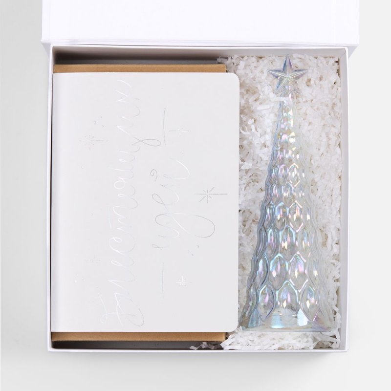 Секрет прост: это особенное перламутровое напыление бокалов и стеклянной елочки-светильника, а еще серебристое голографическое тиснение на самой упаковке и ежедневнике с главным — и всегда актуальным — пожеланием. В такой компании блестящие идеи, без сомнения, будут посещать намного чаще, чем обычно, а весь год будет окрашен в яркие тона, искрящиеся радостью!
