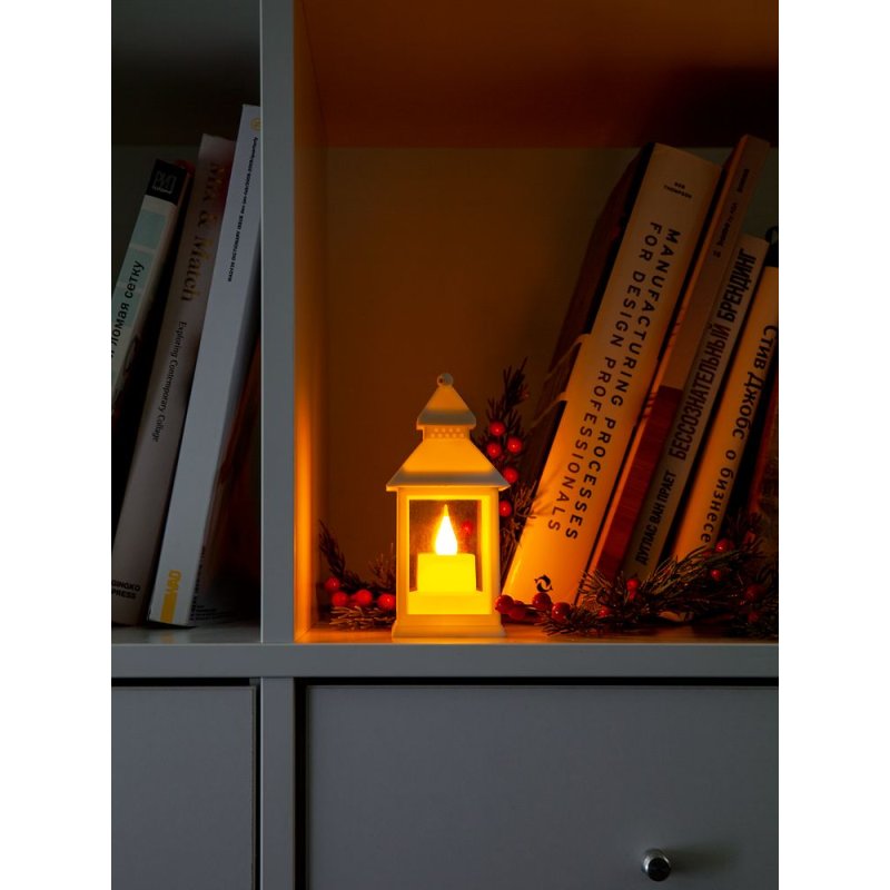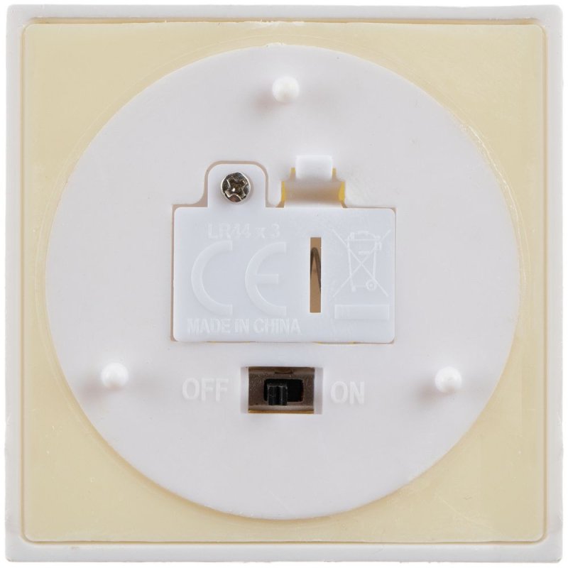 Внутри LED-свеча с теплым светом. Работает от 3 батареек типа LRR44 (в комплект не входят).