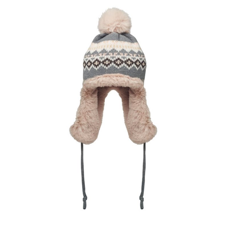Knitted beanie with ear flaps and pompom in acrylic fibre with polyester and fleece lined. Includes label for printing area on one side. Adult size.