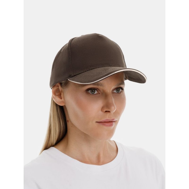 Модель бейсболки с 5-ю клиньями без лобового шва из плотного чесаного хлопка.