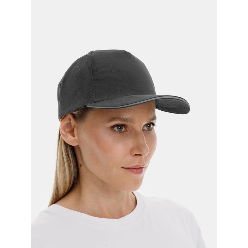 Модель бейсболки с 5-ю клиньями без лобового шва из плотного чесаного хлопка.