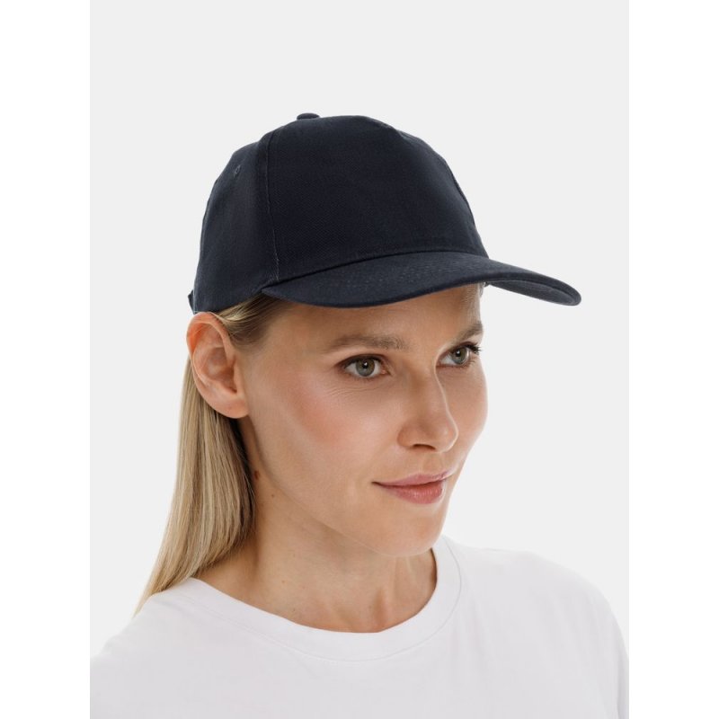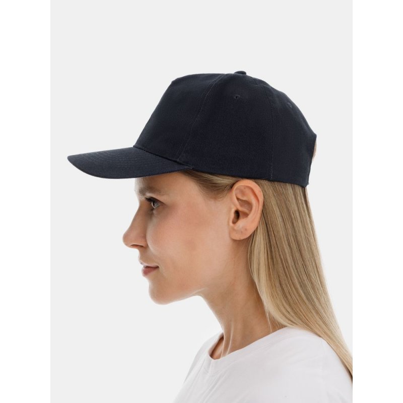 Модель бейсболки с 5-ю клиньями без лобового шва из плотного чесаного хлопка.