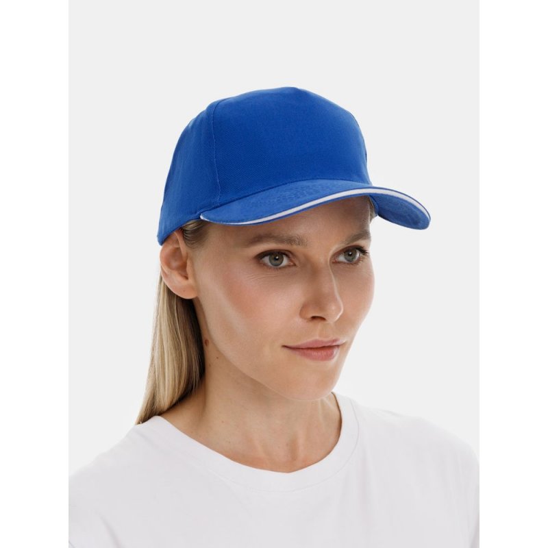 Модель бейсболки с 5-ю клиньями без лобового шва из плотного чесаного хлопка.