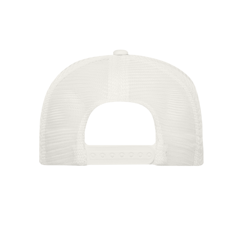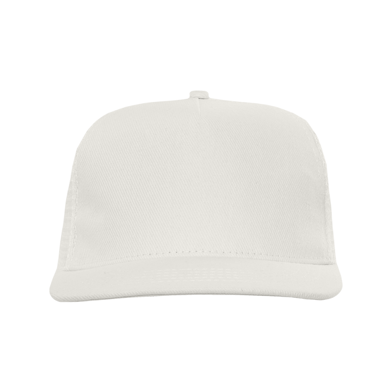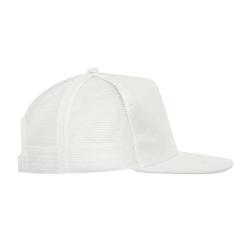 Бейсболка-пятиклинка с прямым жестким козырьком и пластиковой регулируемой застежкой, боковые клинья выполнены из жесткой сетки.