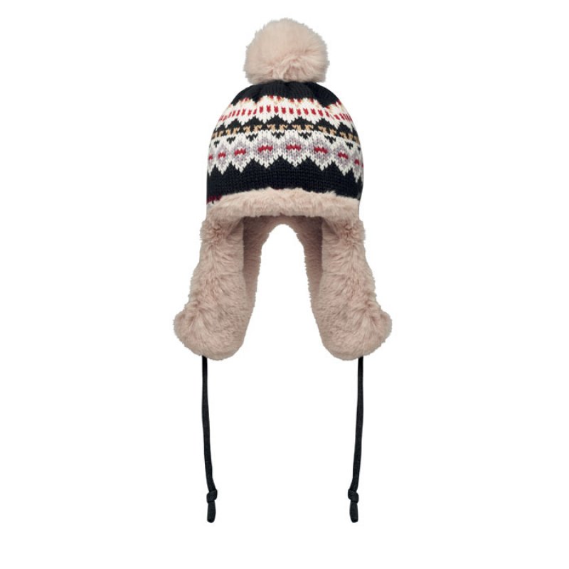 Knitted beanie with ear flaps and pompom in acrylic fibre with polyester and fleece lined. Includes label for printing area on one side. Adult size.