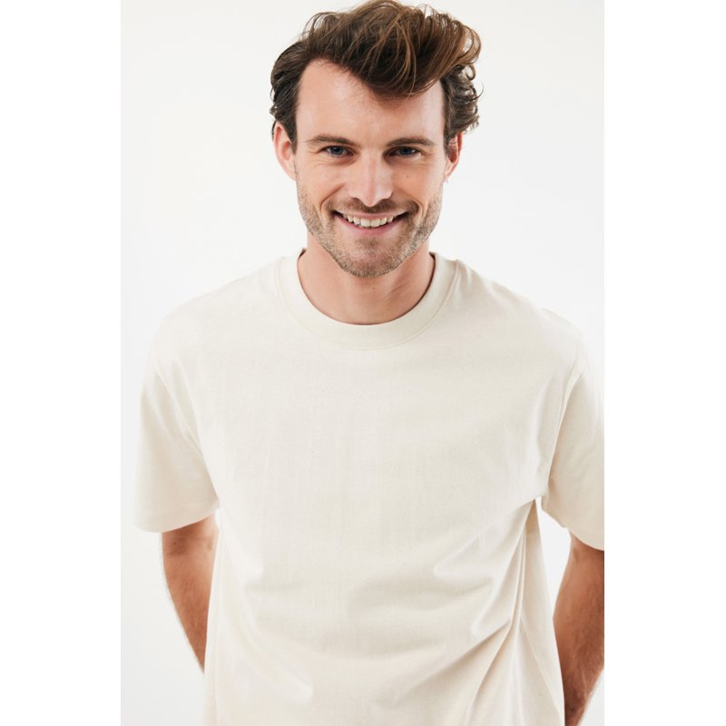 Футболка современного кроя выполнена из 100% хлопка, который на 50% состоит из переработанного и на 50% из органического. Круглый вырез и плотная ткань делают эту модель универсальной.