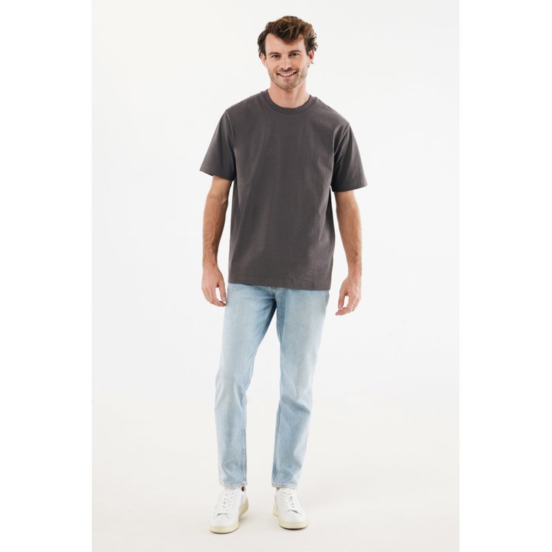 Футболка современного кроя выполнена из 100% хлопка, который на 50% состоит из переработанного и на 50% из органического. Круглый вырез и плотная ткань делают эту модель универсальной.